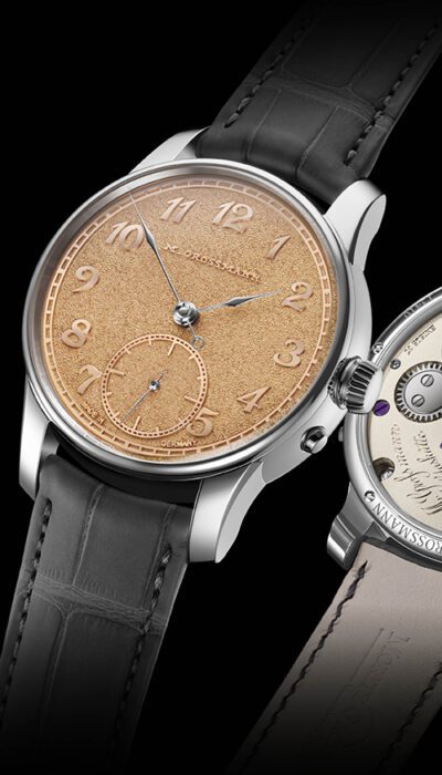 Material and surface form a fascinating liaison. German silver is an alloy of copper, nickel and zinc, among others, which is frequently used in historical watches and movements. Thanks to the surface treatment, this alloy produces a silver-like hue with an aesthetic vintage look. The three-dimensional appearance of the dial underscores the effect: The numerals of the hours and circular small seconds rise above the surface, as does the historic “M. Grossmann” logo from 1875, which goes back to Moritz Grossmann, the famous watchmaking pioneer who gave his name to the Glasshütte manufactory.